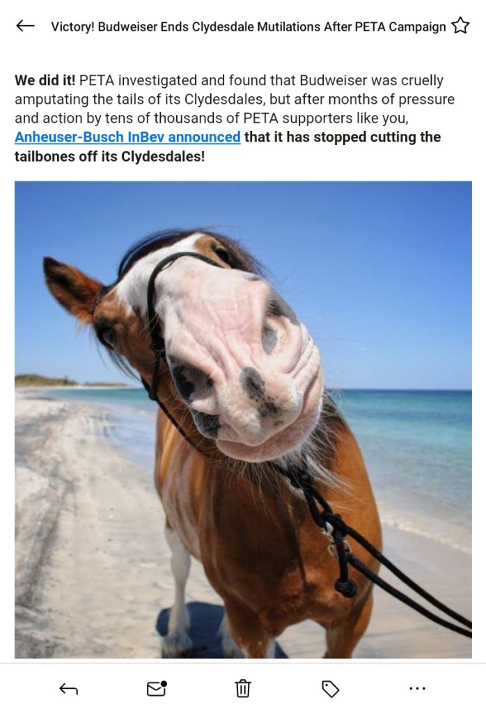 “I am utterly overjoyed to be writing this email to share with you the news that after more than 50 years of unwavering dedication and relentless campaigning from supporters like you, the Animal Welfare (Livestock Exports) Bill has just passed its final stage in Parliament and will soon be enshrined into law.” (UK)