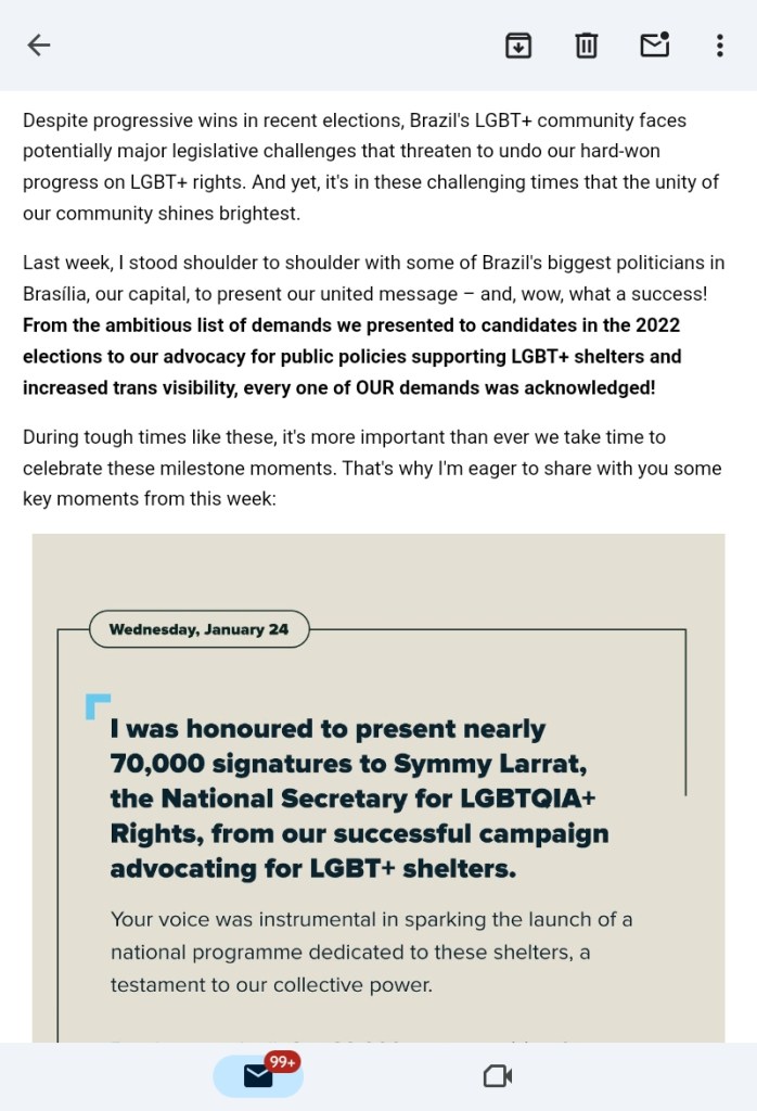 I have also signed many related petitions and sent many related emails, but I’m not specifically into LGBTIQ+ issues. I’m into doing something about injustice.