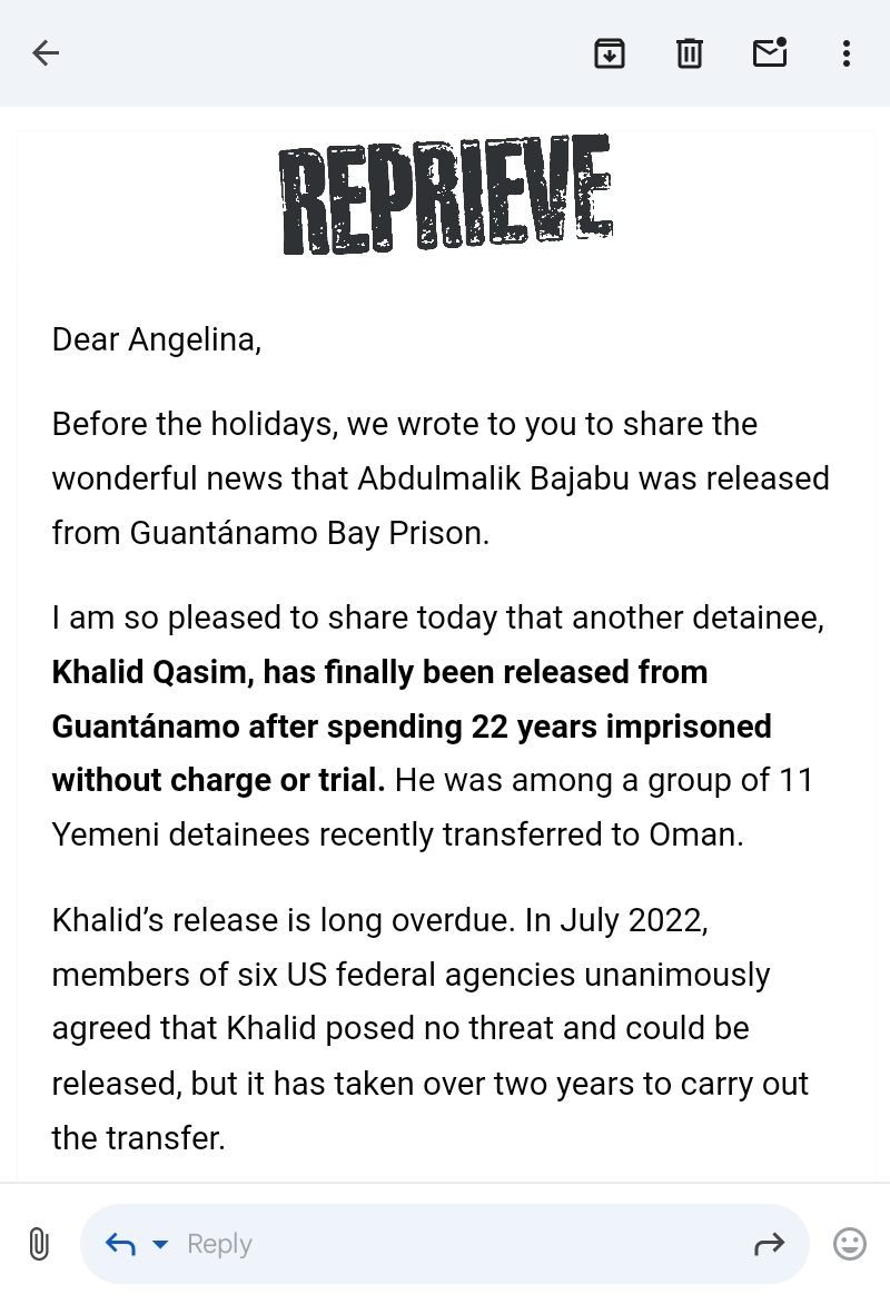 25 June 2022: “Reprieve client Asadullah Haroon Gul has just been released from Guantánamo Bay. Asad is the fourth person released from Guantánamo in the last three years. And he won’t be the last. Together, we are fighting for four other men to be freed. None have been charged with a crime, yet they’re still locked up.”