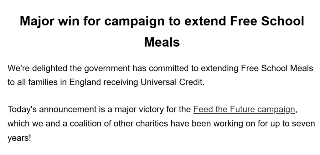 4 April 2022: “Two years ago, twenty thousand campaigners like you came together to write to MPs and Ministers. Together, they called on the Government to keep providing free school meals to children from migrant families. At first, these meals were only offered as short-term support during lockdown. Last week, the Department for Education finally committed to permanently providing these meals. This is a real step forward. It will provide a lifeline for thousands of children.”