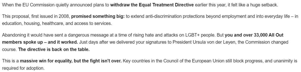 MY COMMENT on AllOut’s wish to expand the EU’s protections against discrimination