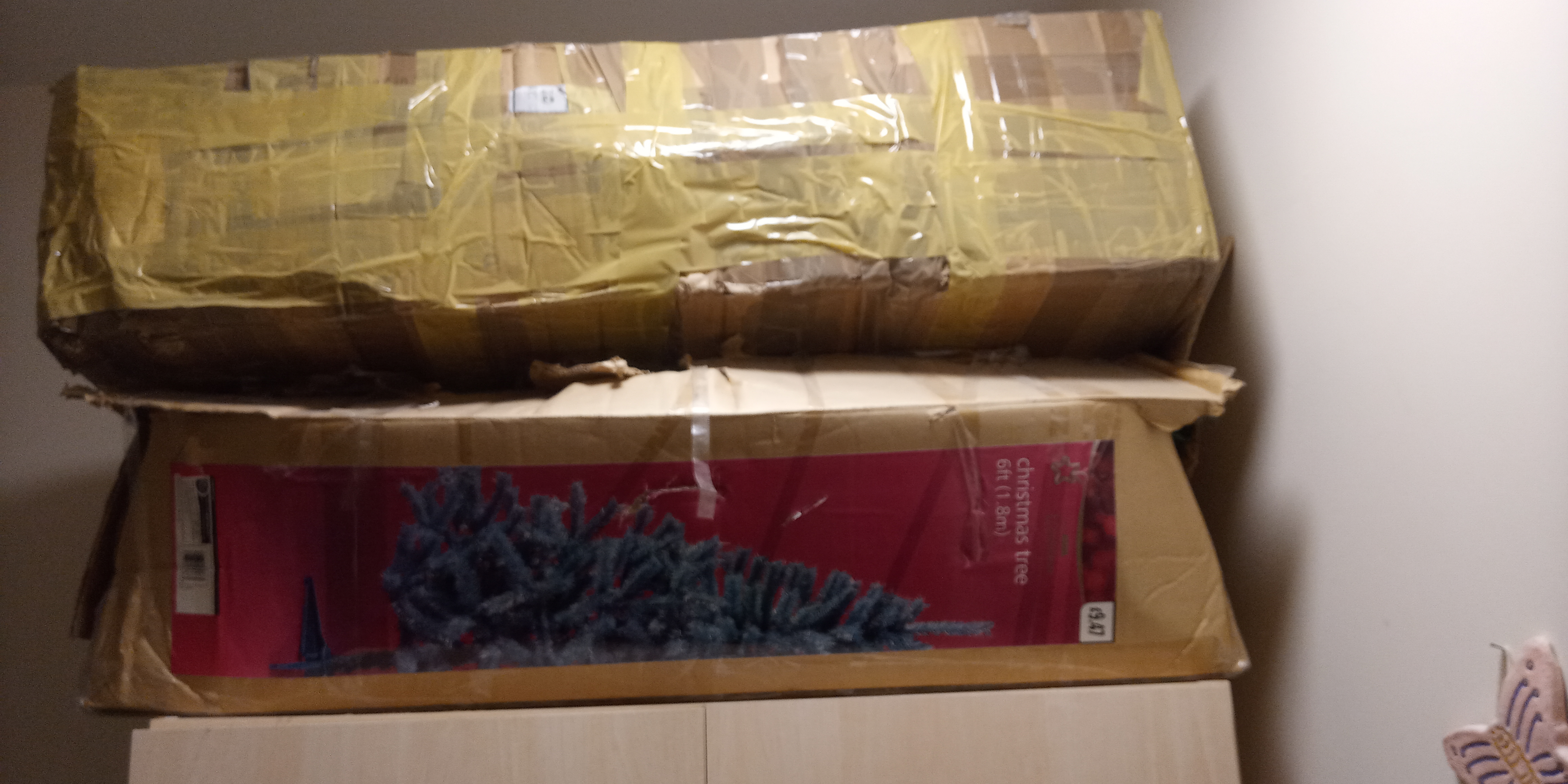 I just discovered that someone today quietly climbed up the stairs to my flat, and slightly pulled out a box on top of my Christmas tree so that I would notice – because of the light above it – that this card below had been left underneath it, folded.