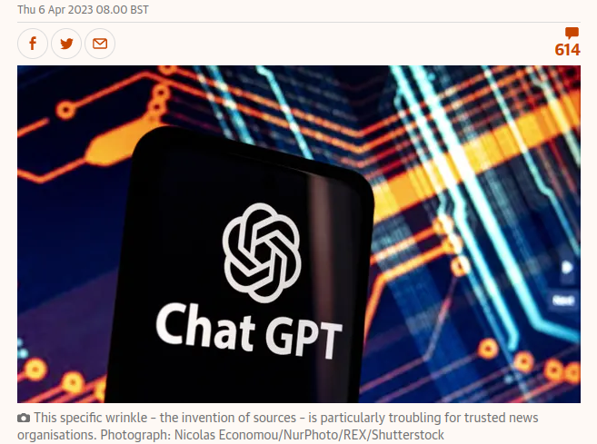 Also, ChatGPT is even worse than I thought. It’s referred to an article in The Guardian that turns out not to exist (https://www.theguardian.com/commentisfree/2023/apr/06/ai-chatgpt-guardian-technology-risks-fake-article, by the Guardian’s head of editorial innovation) and it’s also referred to a non-existing article in The Washington Post about a trip to Alaska that took never place during which George Washington University law professor Jonathan Turley was supposed to have sexually harassed students (https://futurism.com/the-byte/chatgpt-law-professor-false-accusation). Who can he sue about that, I wonder?