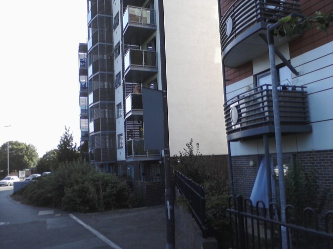6 August 2014, shortly after 5pm. This is at the Fratton bridge roundabout. Who is this guy on the balcony? He threw something at me; I whirled around with my phone and snapped this photo blind, looking into the sun. When I came home, there was more stuff, on one of my two Busbee tablets, when I was e-mailing someone about it. (I had a second one that I tried to keep free from hacking interference.)