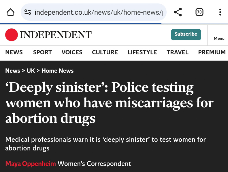 This is tremendously dystopian. Police in England and Wales are blood-testing women who’ve had a miscarriage for abortion-related medications. They’re also studying women’s period apps on their seized phones.