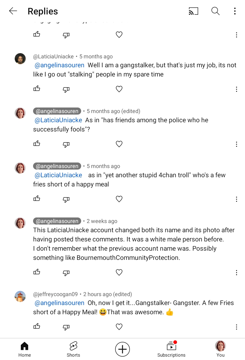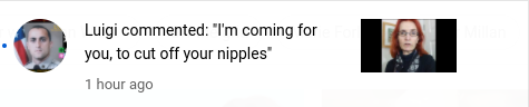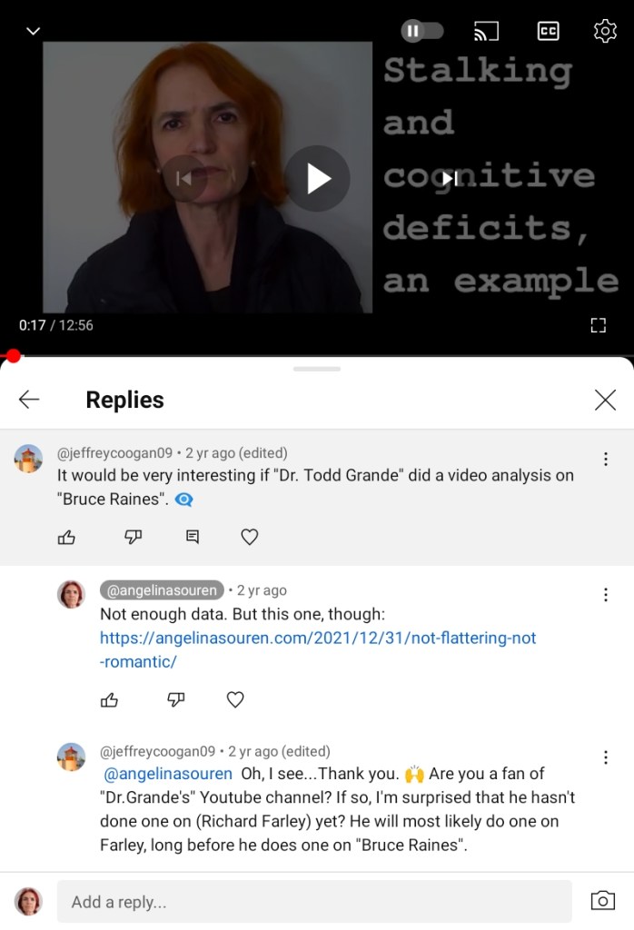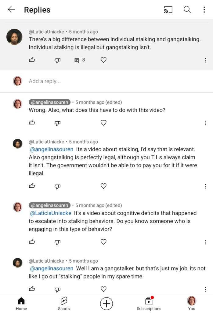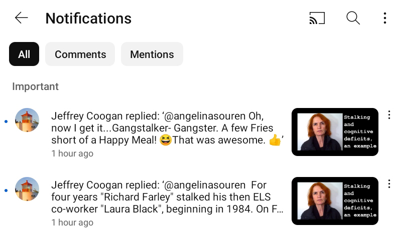 25 March 2024: Another one of those strange gang-stalking comments was just left (by an account that first left a comment on the same video two years ago). A second comment was left today as well, by that account. See below. These aren’t the only gang-stalking comments that I have had.