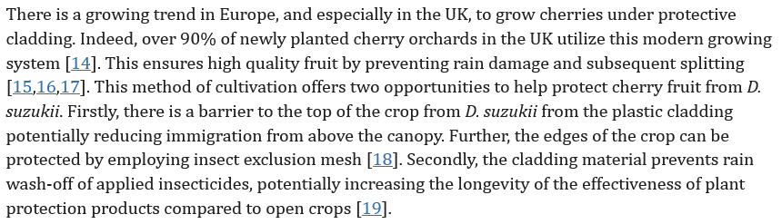 Therefore, exclusion mesh may also be contributing to integrated pest management (IPM) for other cherry pests. In addition, the structures required to grow cherries or other fruits under cladding can be utilized for the mesh system, removing the need for purpose-built frames and additional costs. D. suzukii can move between crops and wild areas throughout the season [6,45] and cherries are one of the first ripening commercial crops in temperate growing regions [46], hence the use of insect mesh can drastically reduce the occurrence of the pest within cropping areas [43].”
