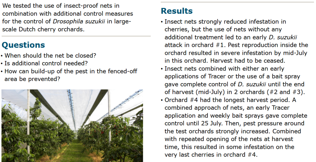 This morning at 04:45 BST, the Dutch version of the BBC – it’s called NOS – published an article in which Dutch cherry growers lament about no longer being allowed to use the insecticides Tracer and Exirel to combat Drosophila suzukii.