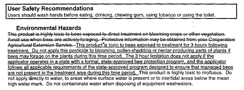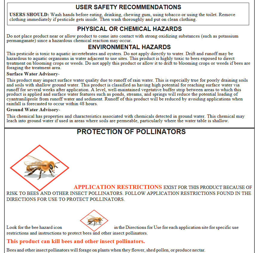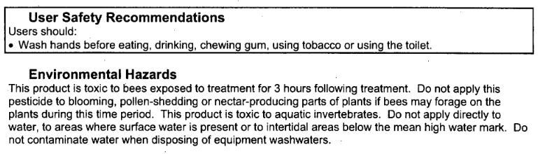 IT IS HIGHLY TOXIC TO BEES, TOO, AS WELL AS TO OYSTERS AND AQUATIC INVERTEBRATES SUCH AS SHRIMP. And it’s new, which means that not enough may be known about it yet.