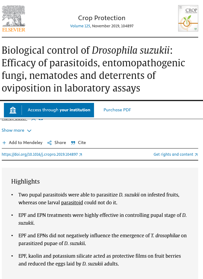 - https://www.wur.nl/en/article/suzuki-fruitfly.htm : “What can fruit growers do to cope with Drosophila Suzukii? Good hygiene during the growing season is very important. By frequently and thoroughly harvesting ripe fruit and removing and destroying rotting fruit, the development of new generations of fruit flies can be prevented.”