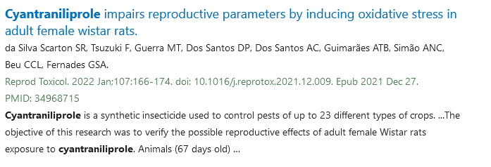 There you have it. I don’t need to look any further regarding why Exirel use should be restricted as much as possible. When I typed “cyantraniliprole ” into PubMed, however, one study this popped up found that it induces oxidative stress and thereby affects reproduction in certain rats. Rats are mammals, just like humans.
