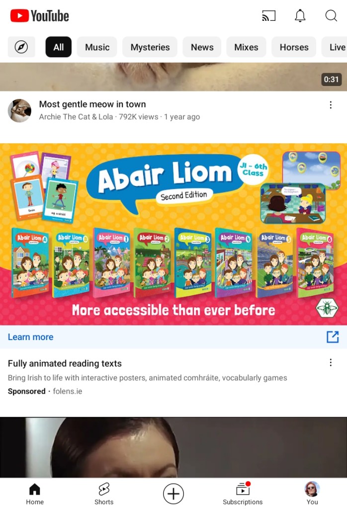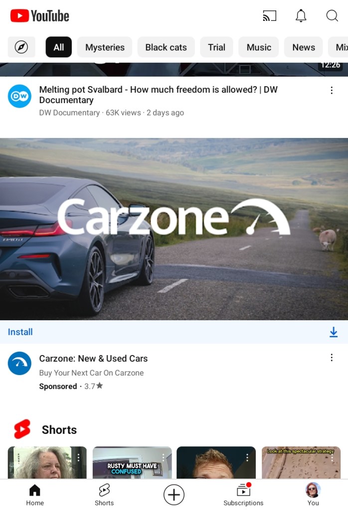 Here below’s yet another one of these strange things. This one is new. (Never mind the YouTube topics. They never make sense. I’ve not even watched anything with black cats, for example. I get the weirdest things in my feed sometimes, and also the weirdest “favorite topics”.)