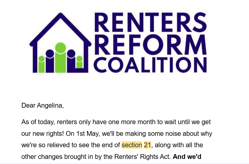 28 October 2025, an email from the Renters Reform Coalition (nothing to do with Nigel Farage):