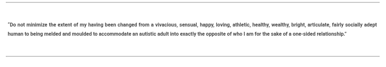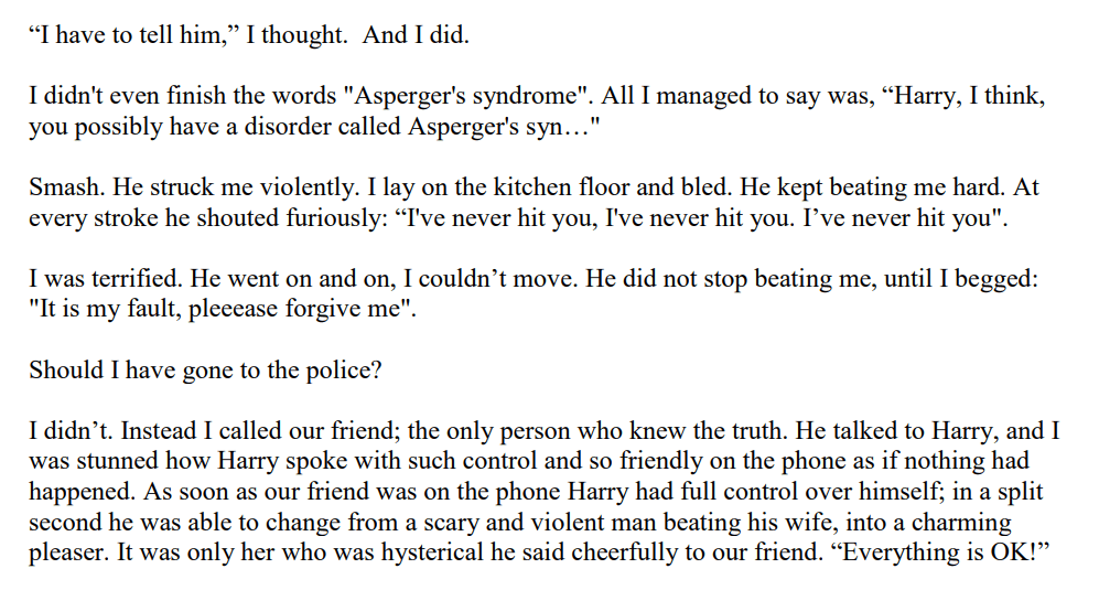 – Open letter to experts in ASD/ High Functioning Autism (this link is to a PDF on this site; I have pasted its contents at the bottom of this page as the original is on a non-secure WordPress website so your browser will likely protest if you try to access it. http://www.aspergerpartner.com/wp-content/uploads/2018/08/Open-letter-to-experts-in-High-Functioning-Autism.pdf