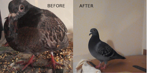 De vorige keer betrof het een zogenaamde squeaker (jonge duif, nog niet vliegend) met een compleet kapotte krop. Het was nota bene de politie die erover had gebeld. Om een uur of 5, 6. Om 11 uur kreeg ik nog steeds smoezen te horen.