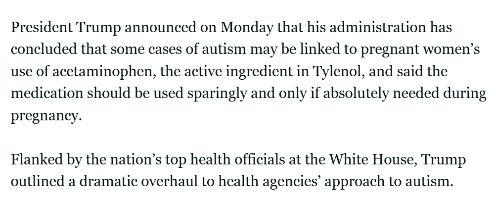 STAT: “President Trump announced on Monday that his administration has concluded that some cases of autism may be linked to pregnant women’s use of acetaminophen, the active ingredient in Tylenol, and said the medication should be used sparingly and only if absolutely needed during pregnancy.