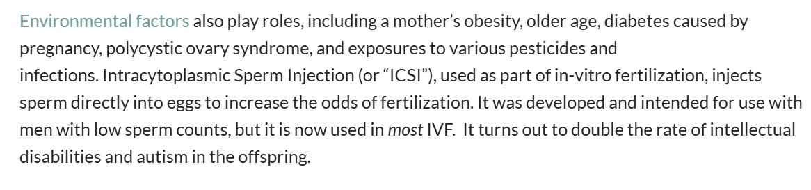 Robert Klitzman: “Environmental factors also play roles, including a mother’s obesity, older age, diabetes caused by pregnancy, polycystic ovary syndrome, and exposures to various pesticides and infections. Intracytoplasmic Sperm Injection (or “ICSI”), used as part of in-vitro fertilization, injects sperm directly into eggs to increase the odds of fertilization. It was developed and intended for use with men with low sperm counts, but it is now used in most IVF. It turns out to double the rate of intellectual disabilities and autism in the offspring.”Nicolas Joncour: https://i-asc.org/our-team/nicolas-joncour/ (who he is and what he does)Continue reading →