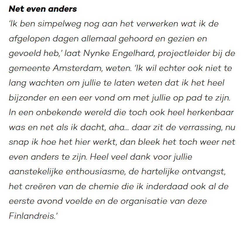 “I’m still processing all the impressions and experiences from this valuable trip,” says Annemarie van Gils, management adviser at De Alliantie. “What echoes most strongly are the words of a woman in the women’s shelter: ‘For the first time in my life, I have a home.’ That is so essential, so fundamentally important. But also striking was the tremendous passion of so many staff members — such as a young woman at the Salvation Army, for example, who beams with joy when she talks about her work for the residents.”
