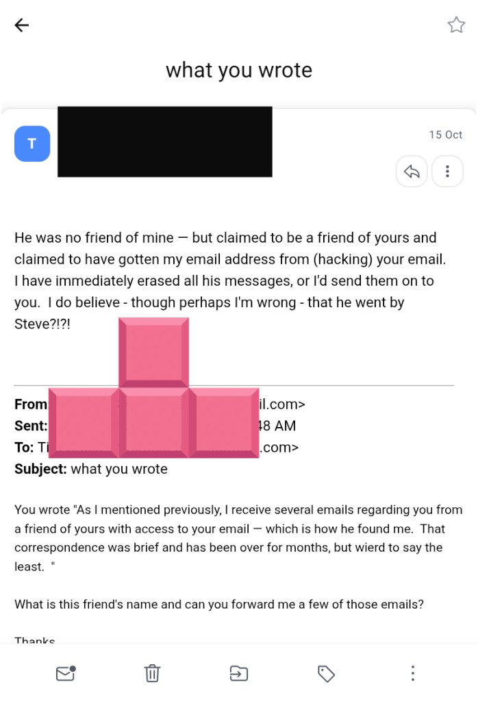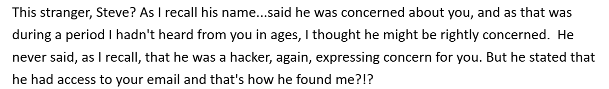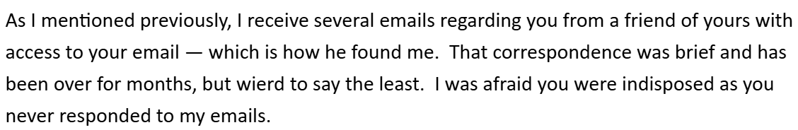 Someone in the US just wrote to me: “I receive several emails regarding you from a friend of yours with access to your email — which is how he found me. That correspondence was brief and has been over for months, but wierd to say the least.”