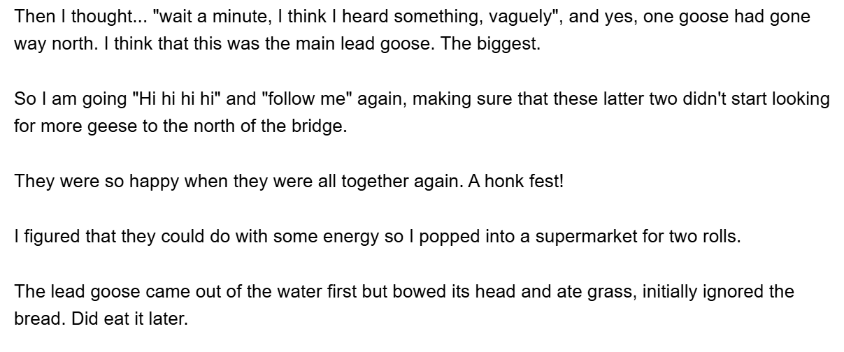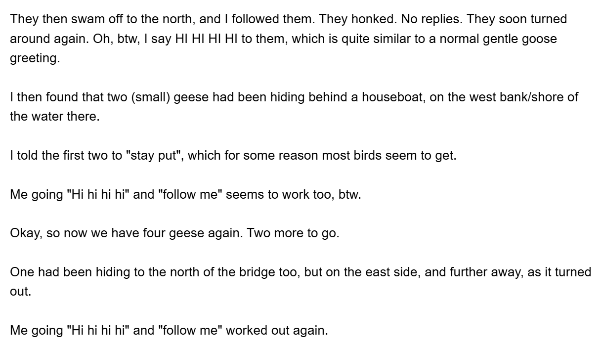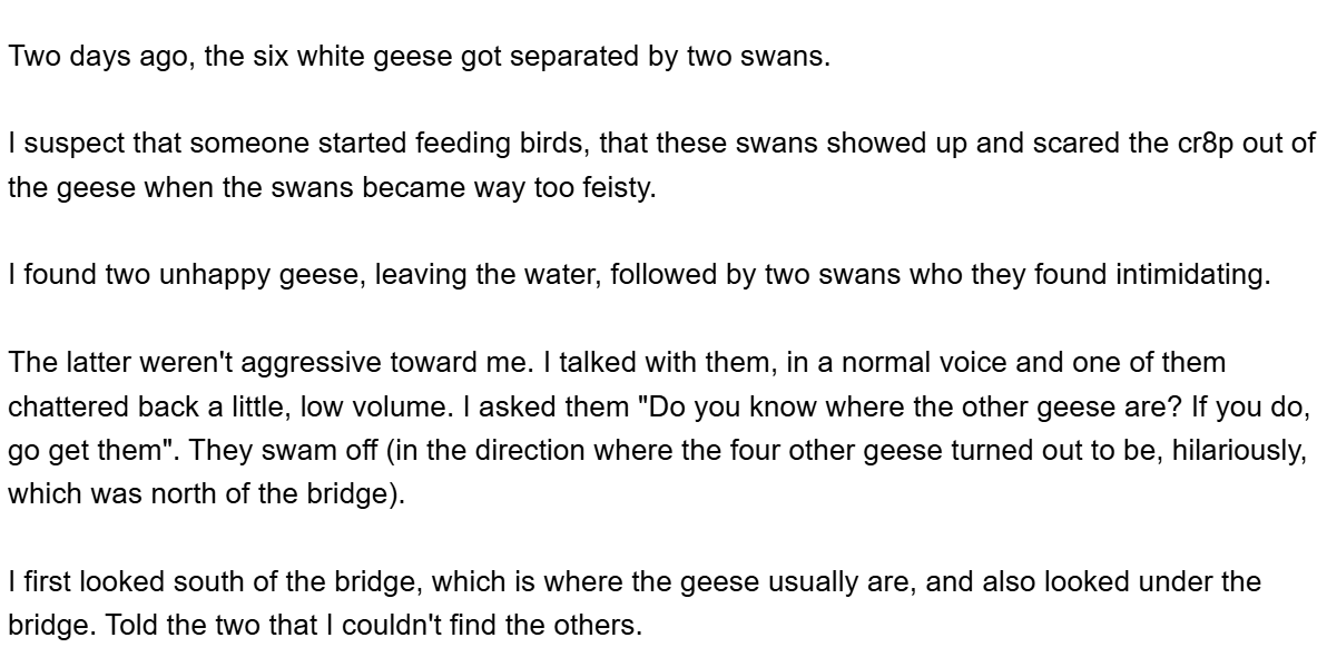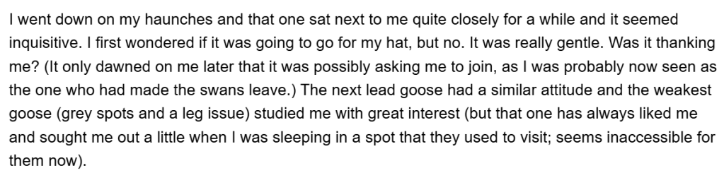 There is a group of six white geese where I am right now and I connected with them months ago, just by talking with them. They often greet me with softer or louder honks. Hi! Hi hi! Hi hi hi! Hi!