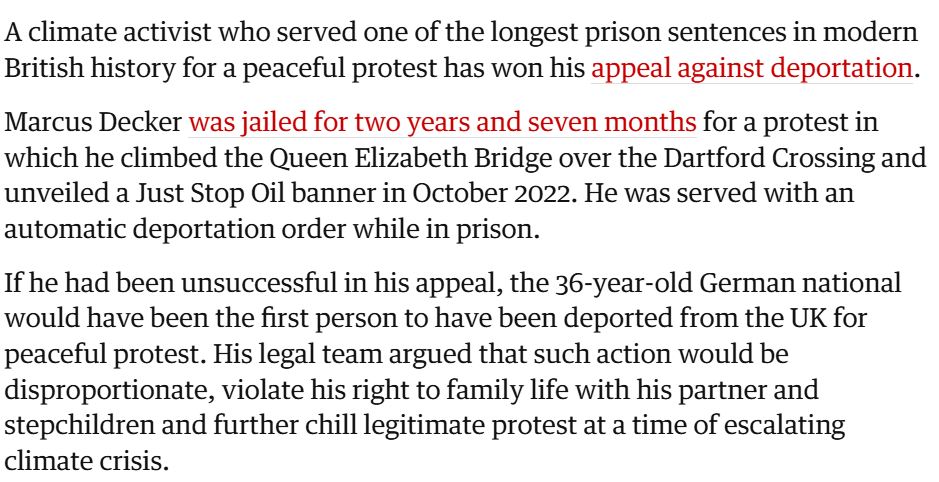 A climate activist who served one of the longest prison sentences in modern British history for a peaceful protest has won his appeal against deportation. Marcus Decker was jailed for two years and seven months for a protest in which he climbed the Queen Elizabeth Bridge over the Dartford Crossing and unveiled a Just Stop Oil banner in October 2022. He was served with an automatic deportation order while in prison.