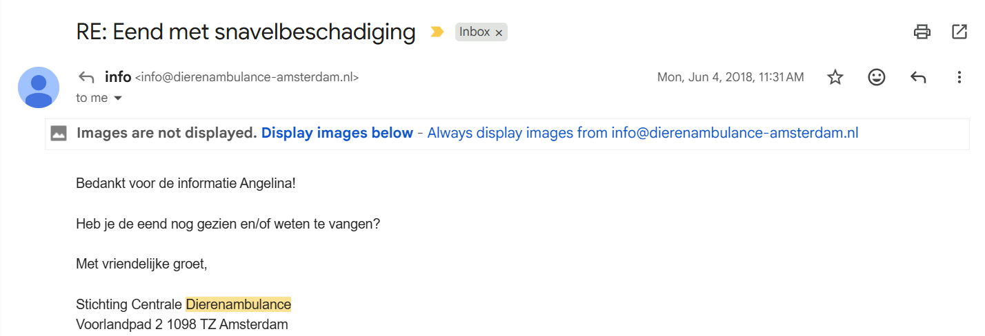 When I called them in August, the menu required you to choose between young birds and “meldkamer” (desk). That is done from within their own perspective and does not keep the public in mind. Members of the public often can’t see the difference between a duck, a Canada goose and an Egyptian goose. I suggested the division “birds” and “anything else” to them in August, among a few other things, such as having people all over town who can very quickly walk to a bird and check out the situation.