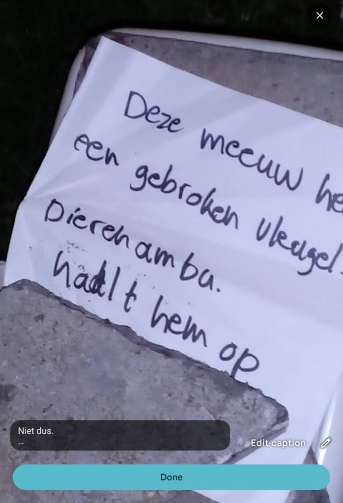 I called De Toevlucht later, hoping that I could take it there, but they weren’t accepting birds because of this mostly human-induced spread of bird flu. Smart decision.