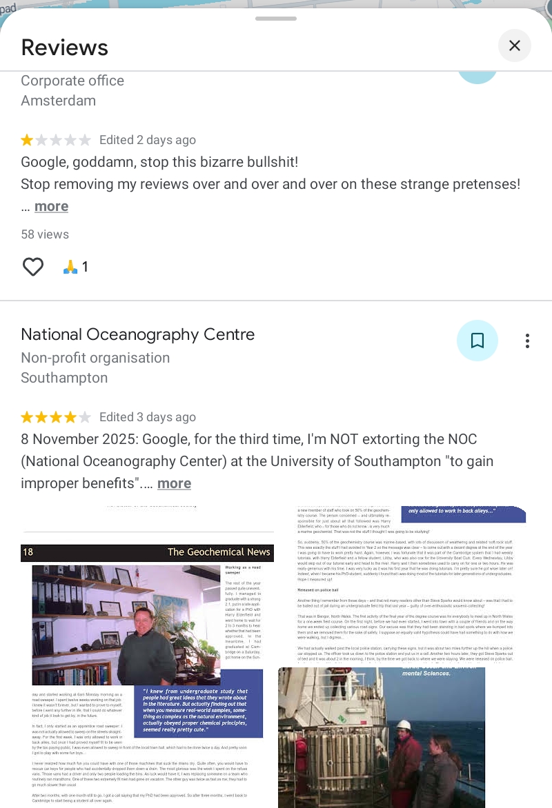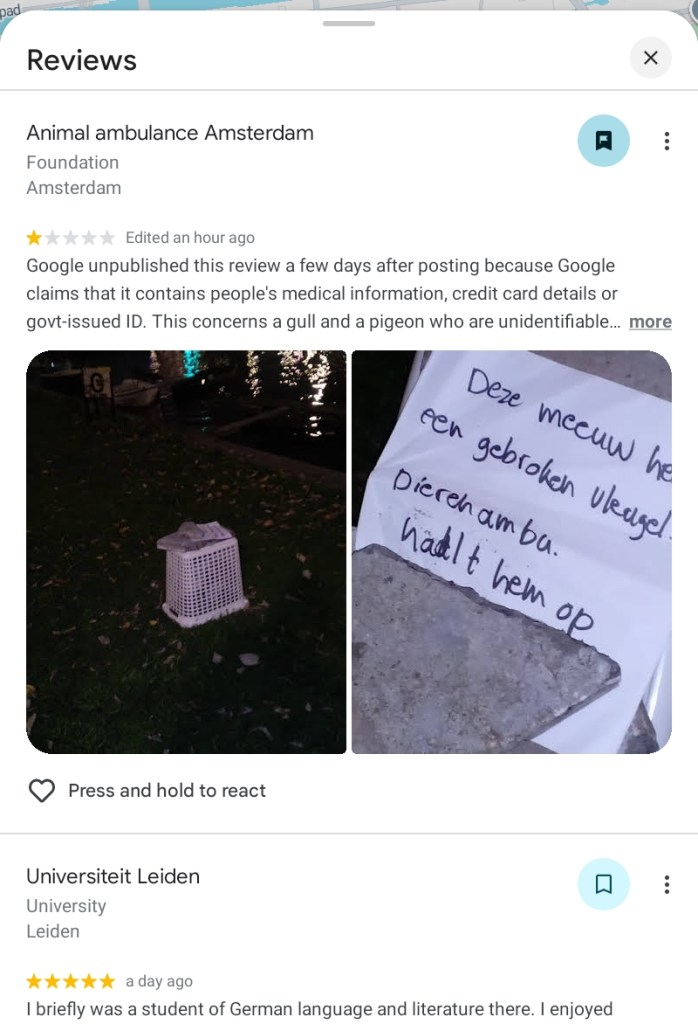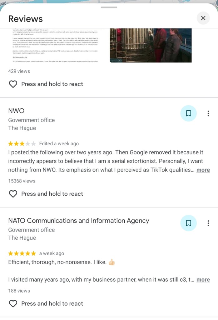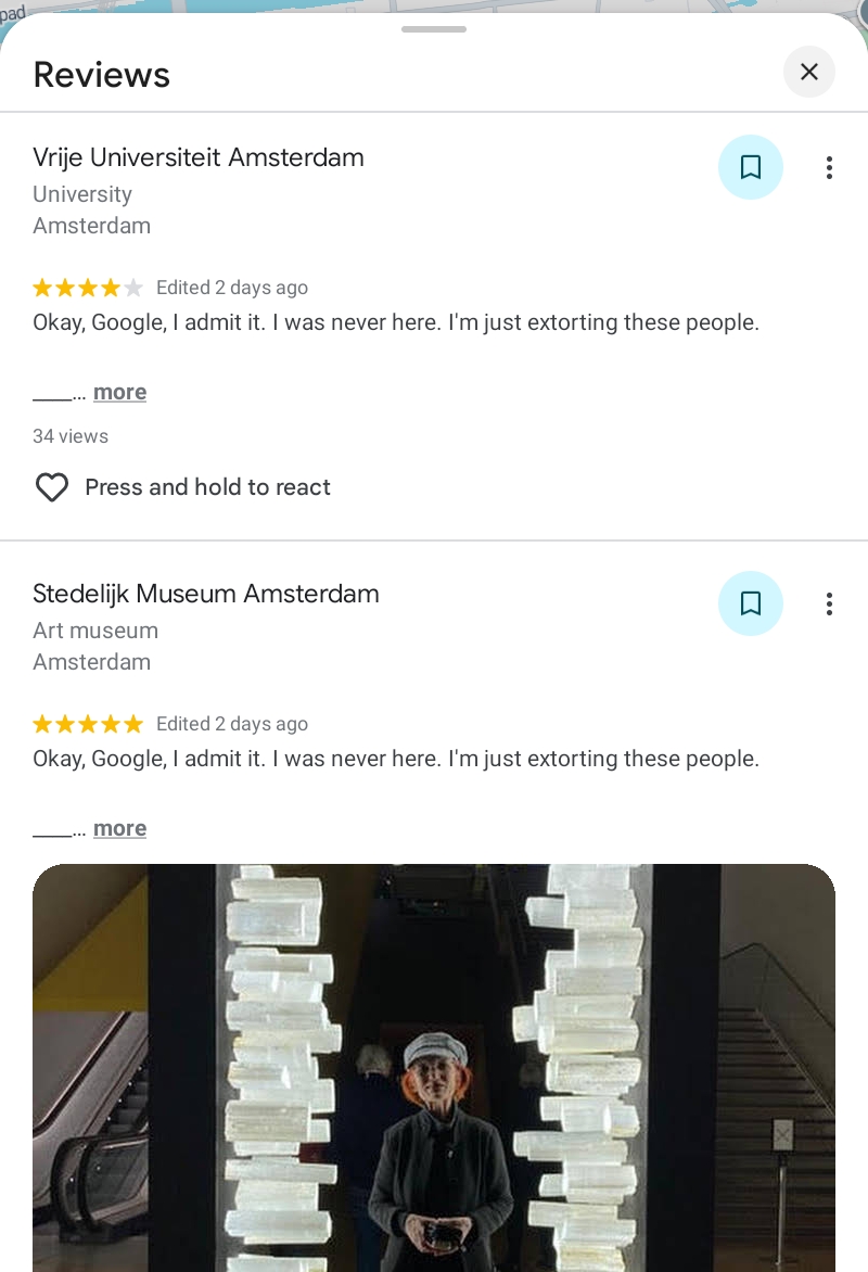 Google increasingly often claimed that I was lying and/or extorting people, such as at VU University Amsterdam. When I started adding evidence that I really had been to or at these places, Google would then refuse the review on the basis of the “low quality of the media” or because it “contained personal information”.