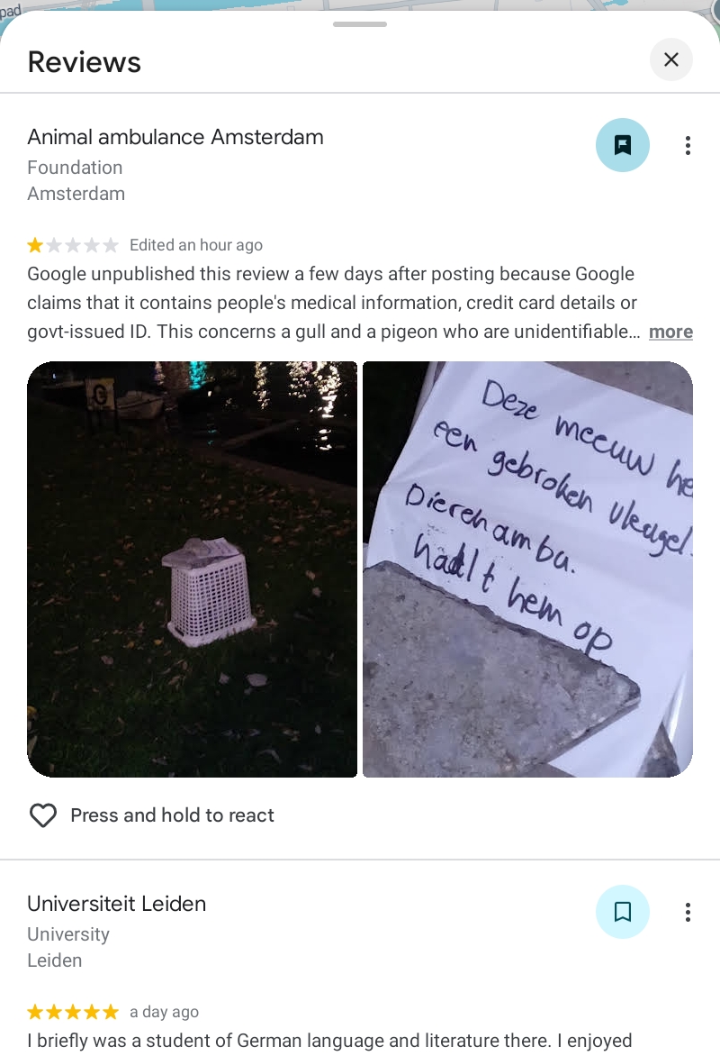 Google unpublished this review a few days after posting because Google claims that it contains people’s medical information, credit card details or govt-issued ID. This concerns a gull and a pigeon who are unidentifiable and are also both likely or possibly dead by now. Humans don’t have wings and humans don’t have a crop, Google. (I know that you don’t know that because your AI search comes up with similar rubbish as, say, “crop wing gull pigeon legal” not being a common legal phrase.)