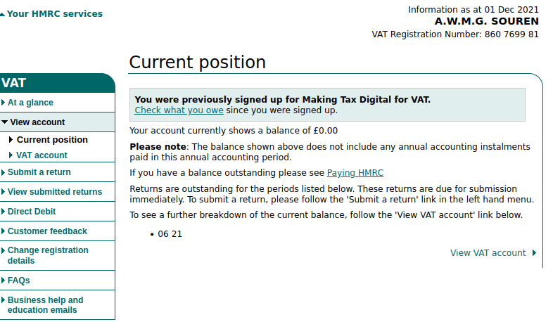 I just logged in again to see what it says and find to my astonishment “You were previously signed up for Making Tax Digital for VAT.“