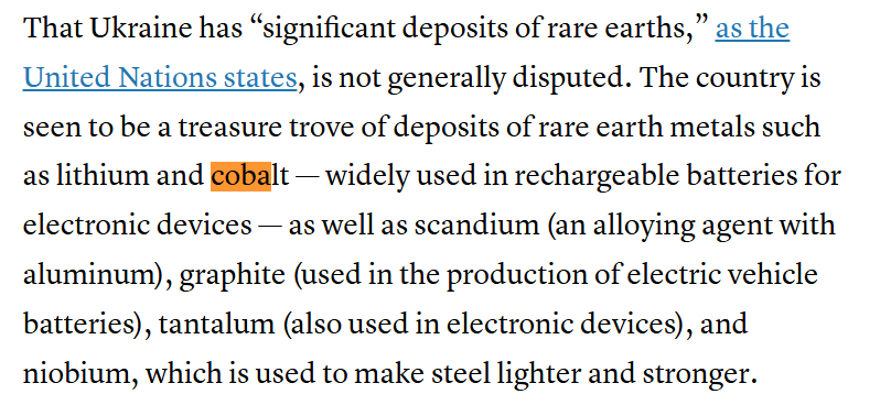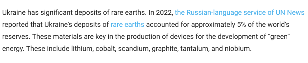“In 2022, the Russian-language service of UN News reported that Ukraine’s deposits of rare earths accounted for approximately 5% of the world’s reserves. These materials are key in the production of devices for the development of “green” energy. These include lithium, cobalt, scandium, graphite, tantalum, and niobium.”
