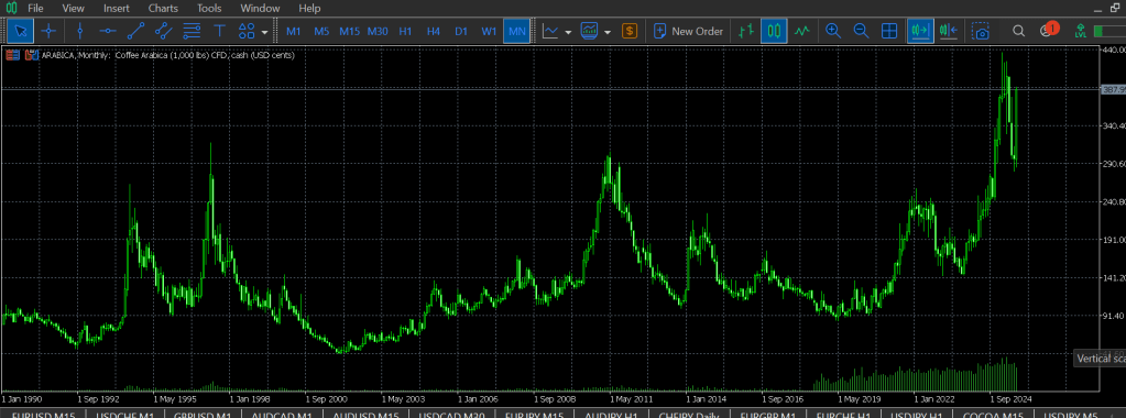 Arabica, 10 April until todayArabica, 1 January 1990 until today (Do you see the effect of the pandemic, when global shipping ground to a halt and prices went up, then came down again? At the time, people were constantly looking which ports had containers stuck in them and which countries that grow coffee had ports from which shipping was still happening.)