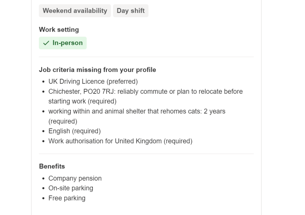 A care-related vacancy in Chichester that was about looking after or playing with two dogs that I had to meet first and that had some other strange nonsense associated with it.