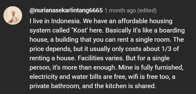 “I live in Indonesia. We have an affordable housing system called “Kost’ here. Basically it’s like a boarding house, a building that you can rent a single room. The price depends, but it usually only costs about 1/3 of renting a house. Facilities varies. But for a single person, it’s more than enough. Mine is fully furnished, electricity and water bills are free, wifi is free too, a private bathroom, and the kitchen is shared.”