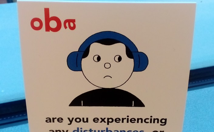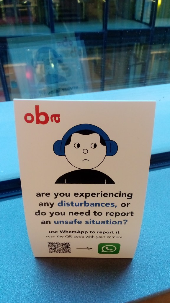 Ik kom al vele jaren op OBA Oosterdok maar ook op andere OBA vestigingen. Sinds zeer kort staan er op OBA Oosterdok kartonnetjes waarvan ik eerst dacht dat ze Wifi informatie hadden. Het blijkt echter over het melden van onveilige situaties te gaan. Ik denk dat u daarmee juist een onveilige sfeer in de hand werkt en zou u aanraden hier advies over in te winnen.
