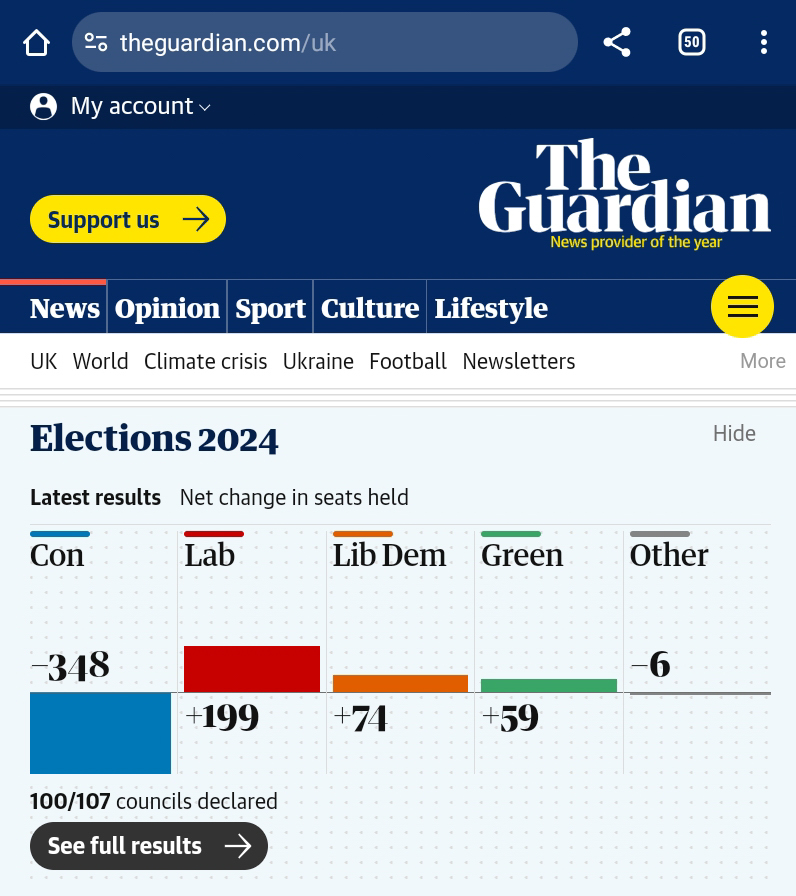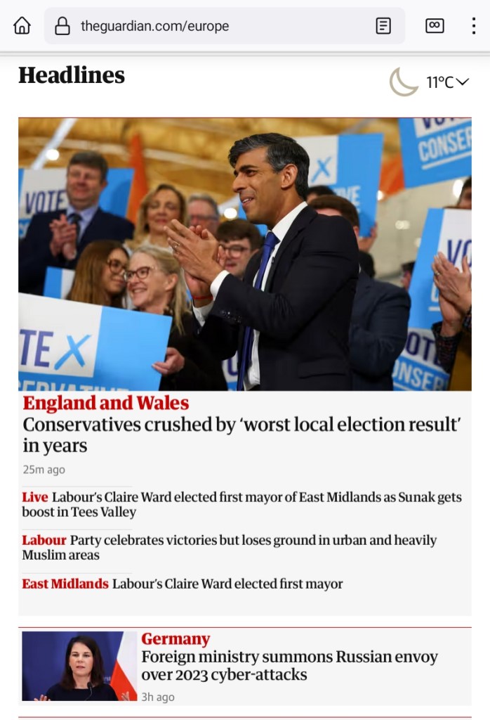 I couldn’t believe that they kept voting for the Conservatives for so long. This is local elections, but still, this is a landslide. I’ll need to catch up and digest this. (Also, will there be a general election soon?)Same paper, different browser…