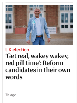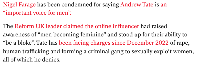 (Oh, wait, a few days ago, wasn’t Nigel Farage openly supporting the pretty extreme rapist and human trafficker Andrew Tate? I will look this up.) (Yeah, Farage was defending him. https://www.independent.co.uk/news/uk/politics/nigel-farage-andrew-tate-general-election-reform-b2566506.html Yikes. Farage is already responsible for a lot of violence against foreigners and now he is whipping up hatred against women even higher than it already is. He was very loud up to Brexit; then he disappeared. Went – of course – abroad. Now that he’s sniffed out an opportunity again, he suddenly pops up again, like a bad Boris imitation. Boris was often terribly offensive, but I don’t think that he’s ever openly promoted violence and physical abuse.) (Caused it? That’s a different question.)