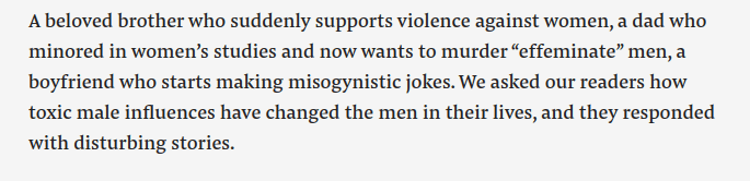 They become supporters of the “alpha male” ideology — a term adopted by the “manosphere” to describe what they consider the ideal version of manhood.