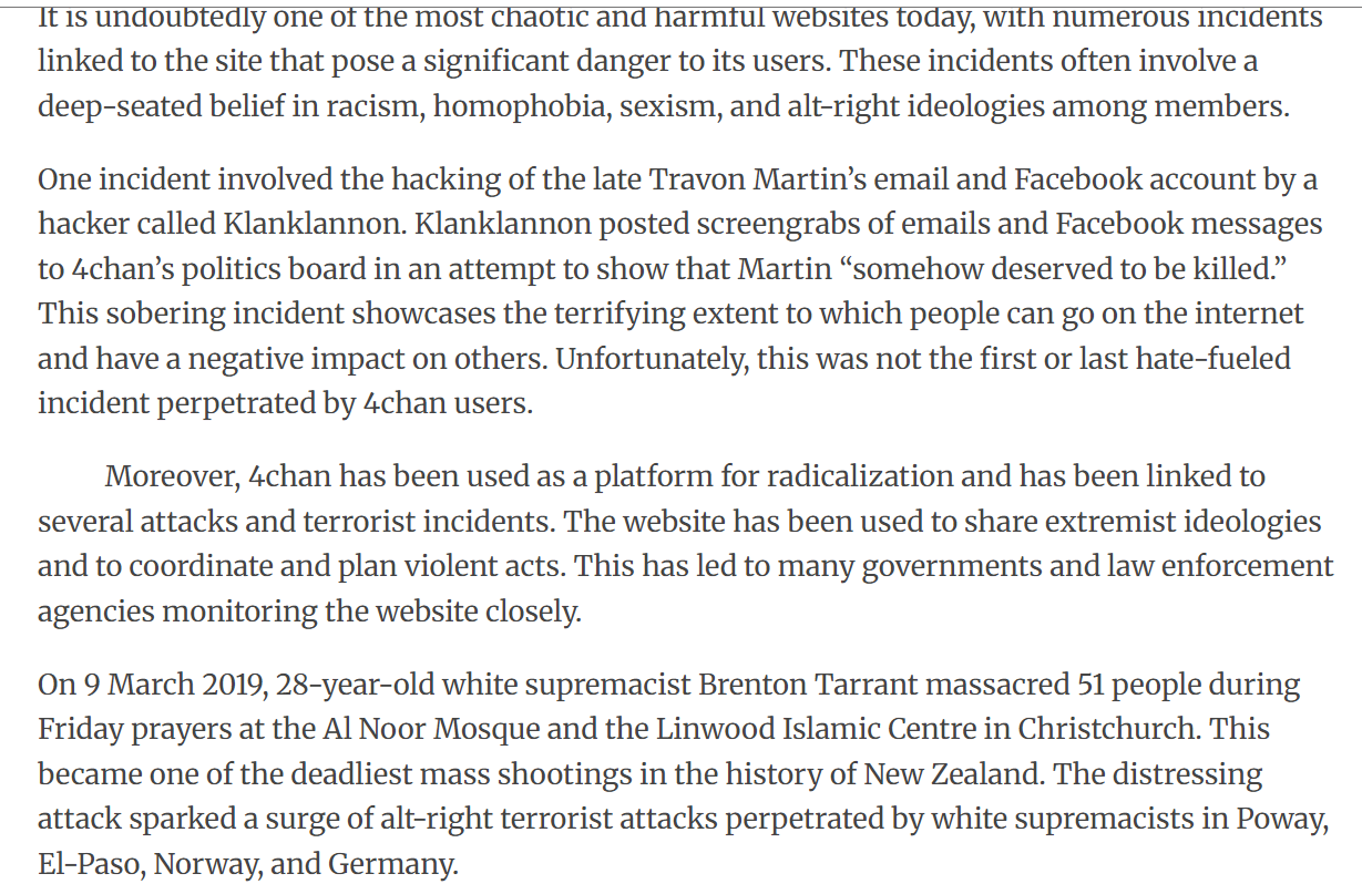 “The imageboard was taken off the clearnet after being linked to several mass shootings.”
