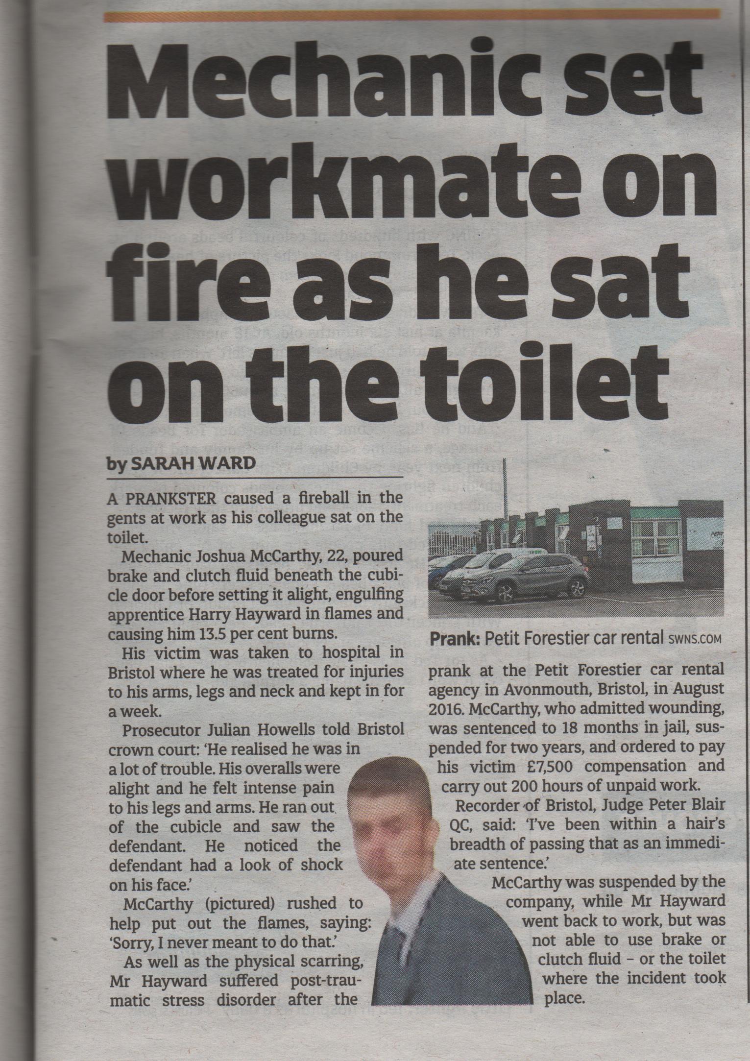 A year later, a similar story caught my eye. Someone set a colleague on fire at work in Bristol. The victim, Harry Hayward, was in hospital for a week because of injuries to neck, arms and legs (13.5% burns). In addition, Mr Hayward contracted PTSD. His colleague was sentenced to 18 months in jail, suspended for two years, as well as ordered to pay £7,500 compensation and carry out 200 hours of unpaid work. Apparently, the judge who gave the suspended sentence came very close to making it an immediate one. Prison time.