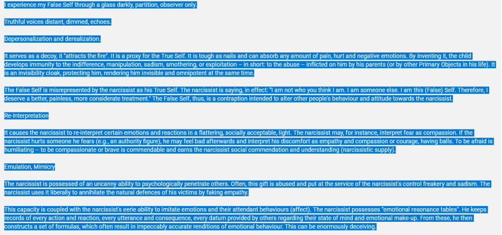 Watch this video in which he explains how he became a narcissist and what it feels like. Note that the true self is definitely there… but he fears it more than anything else. It is not the false self that feels attacked, the false self defends the true self, but he’s completely lost touch with it, emotionally. It’s become, how shall I put it, disconnected. It’s no longer online.