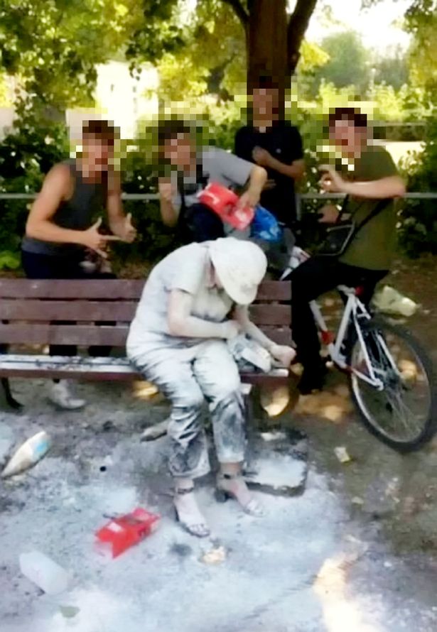 Photo taken of Janice Morris, in her late 40s, being attacked while sitting on a bench, her attackers making various forms of victory signs (such as the horns but also the sign on on the right). One of the attackers took this photo and shared it on Facebook. That’s where it got noticed and that‘s why these attackers later found themselves accused and sentenced in a court of law. I heard about the incident from someone in the States.